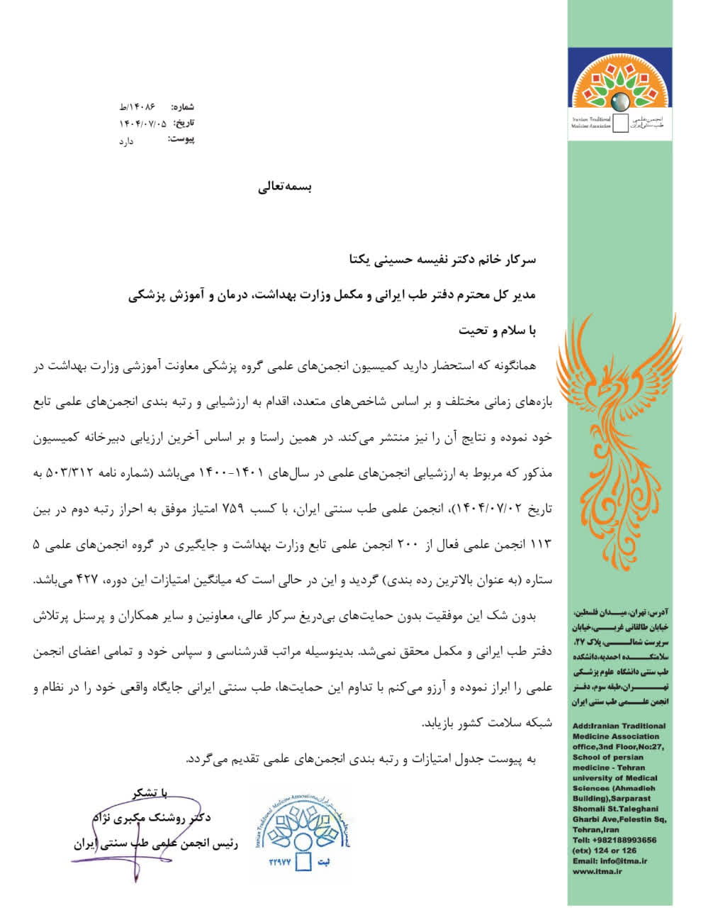 انجمن علمی طب سنتی ایران با افتخار اعلام میدارد که در فرآیند ارزشیابی و اعتباربخشی انجمنهای علمی وزارت بهداشت، درمان و آموزش پزشکی و بر اساس آخرین ارزیابی دبیرخانه کمیسیون انجمنهای علمی وزارت بهداشت، مربوط به سال ۱۴۰۱-۱۴۰۰ (شماره نامه ۳۱۲/۵۰۳ به تاریخ ۱۴۰۴/۷/۲)، انجمن علمی طب سنتی ایران، با کسب ۷۵۹ امتیاز موفق به احراز رتبه دوم در بین ۱۱۳ انجمن علمی فعال از ۲۰۰ انجمن علمی تابع وزارت بهداشت (با میانگین امتیاز ۴۲۷) و جایگیری در گروه انجمنهای علمی ۵ ستاره (به عنوان بالاترین رده بندی) گردید. این موفقیت در حالی کسب شده است که از لحاظ تعداد اعضا، منابع کسب درآمد، حمایتهای مادی و معنوی، حاشیه سازی های مکرر، هجمه های سنگین، محدودیتهای ذاتی و عرضی رشته طب ایرانی، دسترسی به مولفه های قدرت و ...، شرایط انجمن علمی طب سنتی ایران به هیچ عنوان قابل مقایسه با بسیاری از انجمنهای علمی دیگر نبوده و نیست. بدون شک کسب این جایگاه ارزشمند، بدون تلاش شبانه روزی، مخلصانه و صادقانه اعضای هیات مدیره دوره پنجم، تمامی اعضای محترم پیوسته انجمن علمی اعم از روسای شعب، روسای دانشکده ها، مدیران گروهها، اعضای هیات علمی، دانشجویان، دانش آموختگان و همچنین کارشناسان انجمن علمی محقق نمی شد. انجمن علمی طب سنتی ایران این موفقیت را به جامعه علمی کشور، اعضای محترم انجمن و تمامی علاقهمندان به مکتب طب سنتی ایرانی تبریک عرض مینماید. همچنین از حمایتها و همکاریهای شایسته دفتر طب ایرانی و مکمل وزارت بهداشت نیز قدردانی نموده و از دانشکده طب ایرانی دانشگاه علوم پزشکی تهران نیز برای میزبانی مکان دفتر انجمن علمی سپاسگزاری می نماید. (به پیوست جدول امتیازات و رتبه بندی انجمنهای علمی تقدیم میگردد.)