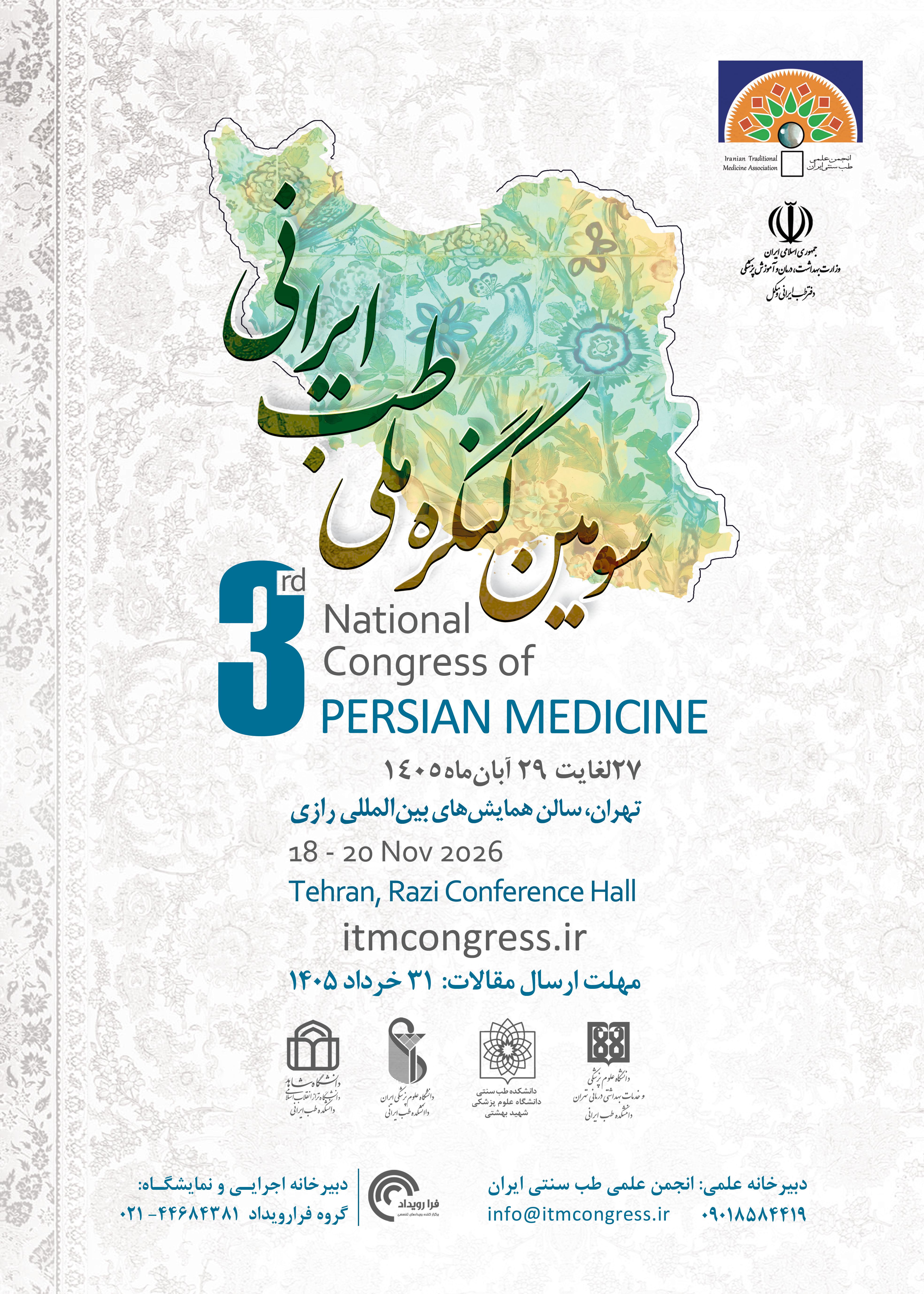 رهاورد پیادهسازی این راهبردها میتواند به ارتقاء کنشگری بالینی، پویایی علوم پایه، توسعه رشتههای پشتیبان و جهانی سازی طب ایرانی کمک شایانی بنماید. باور کنیم که سرمایه گذاری برای طب ایرانی از ابعاد مختلف امنیتی، سیاسی، اقتصادی و دانشی، سرمایهگذاری برای آینده کشور و تقویت قدرت پدافندی کشور در مقابل آفندهای دارویی و درمانی دشمنان خواهد بود. بپذیریم که در این صورت آینده بهتری فراروی کشور عزیزمان خواهد بود و برای رسیدن به آن تلاش کنیم. از این رو امروز با افتخار میزبان بزرگترین رویداد علمی کشور در حوزه طب ایرانی هستیم. ارسال حدود 600 مقاله به دبیرخانه کنگره و رشد حدود 40 درصدی مقالات نسبت به کنگره اول، بیانگر پیوند تجربه، علم و نوآوری در چهارچوب تولید شواهد معتبر می باشد. به این امید که شاهد تبلور طب بومی میهن عزیزمان در نظام سلامت کشور باشیم. در پایان بر خود واجب میدانم از همراهی صمیمانه و دلسوزانه دبیر علمی کنگره جناب آقای دکتر رضاییزاده، دبیر اجرایی کنگره سرکار خانم دکتر زارعی و کارشناسان پر تلاش دفتر انجمن سپاسگزاری کنم. قدردانی ویژه و تشکر خاص خود را تقدیم میکنم به سرکار خانم دکتر حسینی یکتا مدیر کل محترم دفتر طب ایرانی وزارت بهداشت و معاونین و پرسنل دفتر طب ایرانی. همچنین ارج مینهیم حضور اساتید ارجمند: استاد محترم جناب آقای دکتر آخوندزاده معاون محترم تحقیقات و فناوری وزارت بهداشت، جناب آقای دکتر سعید سرکار رئیس مرکز توسعه فناوریهای راهبردی معاونت علمی و فناوری ریاست جمهوری، جناب آقای دکتر مرندی و اعضای پیوسته فرهنگستان علوم پزشکی کشور، ریاست دانشگاه علوم پزشکی تهران جناب آقای دکتر رئیس کرمی، ریاست دانشگاه علوم پزشکی سبزوار جناب آقای دکتر چمن، ریاست پژوهشکده غدد و متابولیسم دانشگاه علوم پزشکی تهران جناب آقای دکتر باقر لاریجانی و سازمان نظام پزشکی کشور